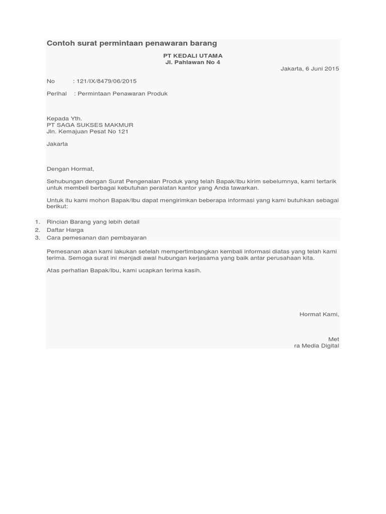 Contoh surat penawaran dan pemesanan. Dalam dunia bisnis, penawaran akan selalu ada antara pihak satu dengan pihak lainnya. Tidak hanya terbatas pada produsen dan konsumen saja, bahkan sesama pelaku usaha (produsen) pun juga saling memberikan penawaran. Surat penawaran barang juga termasuk ke dalam surat resmi sehingga ketika anda menulis surat ini maka anda harus menggunakan bahasa baku alias bahasa yang formal. Ya tentunya kali ini badrul mozila akan memberikan gambaran dan contoh surat pesanan barang yang benar maupun tahapan alur dari pembuatan surat pesanan. Maksud dan tujuannya adalah untuk meminta informasi lebih rinci/detail mengenai suatu produk atau jasa yang ditawarkan. Tanpa harus menunggu surat penawaran anda bisa bisa mengirimkan surat pemesanan secara langsung jika berminat. Klik tombol di bawah berikut dan dapatkan contoh surat penawaran barang word yang bisa digunakan langsung untuk keperluan perusahaan dan pribadi. Mungkin sedikit berbeda dengan surat lainnya, dalam surat penawaran kerjasama terdapat up / alamat perusahaan, tujuan pengiriman surat, jenis barang/jasa, harga dan. Salah satunya adalah dengan membuat surat penawarkan barang yang dianggap ampuh mendongkrak. Terimakasih atas surat saudara no. Detail kontrak penawaran tersebut tertulis untuk. Contoh surat permintaan penawaran merupakan surat yang diajukan kepada orang/badan/organisasi yang memiliki produk atau jasa oleh peminat produk tersebut.